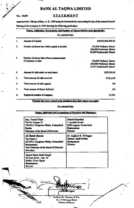 The names appear on an unpublished shareholders register of Bank Al Taqwa that reflects holdings as of December 1999. Bank Al Taqwa is based in the Bahamas; the Al Taqwa group (which changed its name to Nada Management Organization a year ago, after authorities began an investigation into its dealings) is headquartered in Lugano, Switzerland. In November, the U.S. named the Al Taqwa network a funnel for Bin Laden’s al-Qaida financial network. Representatives of the bank have denied any involvement in terrorist activities.
