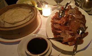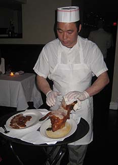 Of course, the pi¨ce de résistance was the Peking duck. It was brought out on a rolling cart and set to where we could see an expert kitchen worker carve it, moving his long knife through the bird as if it were butter, the pieces of duck layered as if in a design around a platter.