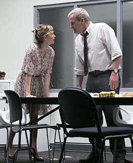 Later, as moments get heated, in the canteen, she steps on garbage cups and plastics falling out of a tall bin. Seems a bit crude. Director Joe Mantello makes it appear like a TV real action moment.