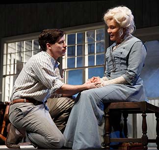 Mary is like a wilting flower among the men. She is sweet as an ingénue in a blue dress and white upsweep. Her delicate voice is colorful, musical, floating, high and fluttery, then low. She shows robust emotion while never raising her voice.