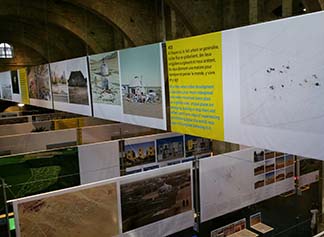 On the theme of architecture, cities and human habitation, it is built of criss-crossing panels reaching high to the ceiling, all of them dealing with phases of human development on this planet. Directed by Francine Fort, and using words like “connectivity,” “empowerment,” “special justice,” it turns global politics into art.