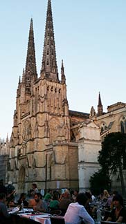 Going back in time again, the cathedral was once a 12th century Romanesque church. It was enlarged in following centuries, till by the 15th it had become flamboyantly gothic. The cathedral square had a statue of the king on horseback, but that was removed at the time of the French Revolution. Another revolution was made by Mayor Juppé. The square once had been a parking place, and the church was surrounded by car traffic. Now that is all gone, and the cars are replaced by terrace cafes. Cars park underground and people ride trams.