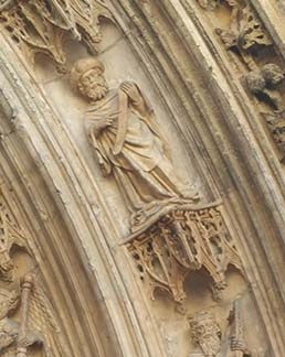 Christine showed us something special about the 15th century Eglise Saint-Pierre (all but the choir was rebuilt in the 19th). Look at the sculpted figures on the right side of the arch. The third from the bottom is a pilgrim – we know that from his hat with the sign of pilgrims, a shell with waves of the river. In one hand is a paper roll, and the finger of the other points south, the direction of the pilgrimage destination, Santiago de Campostela.