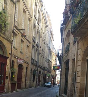 Houses had gables in the 16th century, and in the centuries to follow, roofs became flatter. We saw one with an iron rail with a medallion of the house owner. There‘s a reason for the wrought iron on buildings. Bordeaux had been famous for swords, and when guns put swords out of business, the sword makers turned to creating wrought iron railings. (Swords into plowshares?)