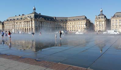 The size of the mirror is 180 meters long, 40 meters wide, 2 centimeters of water deep over a granite base. It was planned as a mirror of the buildings on the stock exchange square. But, there are moments when it stops being a mirror and shoots up in mists. The water disappears and then in a musical rhythm is pushed out by round plates as mist. It was designed ten years ago by landscape artist Michel Corajoud and is listed as a contemporary World Heritage Site by UNESCO. People, kids, love to walk through it. Young people gather there in the evening.