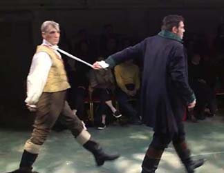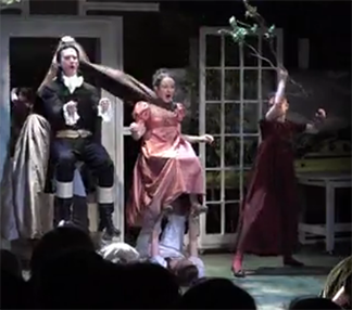 The protagonists sometimes scowl, smirk, sneer, scream, run with branches to represent a forest, are pushed around on roller chairs, pass through moving doorways that reflect entrances and exits, and occasionally face inches away from first-row audiences to pull them into the plot. Not quite Bedlam but you get the very idea from this troupe that believes in “the immediacy of the relationship between the actor and the audience…collapsing aesthetic distance…[in] a kinetic experience of shared empathy.”