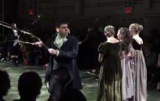 There are lovely gossipy choreographed numbers, including a dinner with diners pushed on chairs directly to the audience to talk to them, knives and forks in hand. When two carriages arrive, the passengers are sitting on the upturned legs of two other performers. In another scene, Edward Farrars arrives holding the reins of “a horse,” a snorting actor. Characters brandish branches of trees. Scenery moves. Gossips are caricatures. Lit chandeliers sway wildly over the stage. Someone who is supposed to sing an aria sings “Aria, aria, aria, aria!
