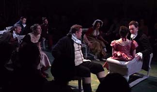 My favorite character is Mrs. Jennings (Nicole Lewis), the grinning, jokey, white-capped mother of the Middletons, who give the Dashwoods a place to live. She takes a good-natured match-making interest in the proceedings. Though it turns out, alas, that the matches seem derailed because the eligible men have other women. (It will be fixed.) In the meantime, there are many gossips eves-dropping on lovers.