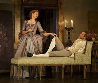 I seem to be using the word a lot lately: hokey. Chandeliers with lit candles descend to sounds of operatic “ah ah” and pretentious violins. The story is based on a French epistolary novel written in 1782 and meant as a satire. But with the direction by Josie Rourke, you get the feeling that audiences are invited to enjoy the sex stuff. It‘s basically about a guy putting notches on his bedpost. (“Sex in the 18th-century French City”?)