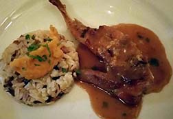 A favorite was quail stuffed with goat cheese in a port wine reduction. It was accompanied by a soft mild rice set off by a fruity sauce. (And a Languedoc red wine) Again, fowl needs fine tuning, and fruit and port for this collection were an excellent choice.