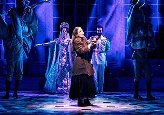 And then, they find Anya (Christy Altomare) who has amnesia. Could she be Anastasia? Altomare has a sweet colorful singing voice and is a charmer. They take up abode in a ruined palace, with visual ghosts of the past, and as the snowy winter turns to spring, she will learn the family tree and stories. Aaron Rhyne‘s projections are stunning, with lifelike onion domes and canals.