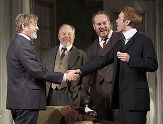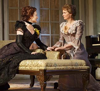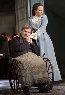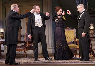 The Hubbards have contempt for the aristocratic planters who were too “high-toned” to adapt. Brother Ben declares, “We took over their land, and their cotton and their daughter.” That would be Oscar’s wife Birdie (the very subtle and sensitive Cynthia Nixon), the na¯ve daughter of a planter. In Hellman‘s story, these strivers are crude and nasty, to their spouses and to each other. Director Sullivan makes it clear they are mercantile thieves.