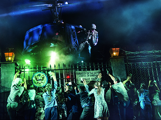 The best parts are terrific production numbers about real events, especially the thrilling dragon dance of the Vietcong that shows its victory over the U.S. And the famous desperate scramble of people trying to get into the U.S. embassy grounds to catch the last helicopter out. There are loud sounds of the chopper. Choreography is by Bob Avian.