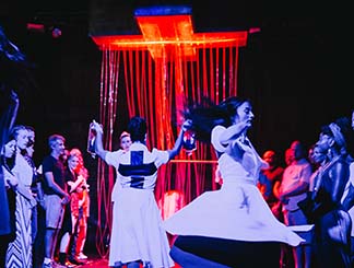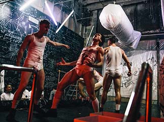 Then, parallel to the lines, the soldiers race furiously in a dance that exudes violence – the choreography and the singing are the best parts of this production. Heffington is the choreographer.