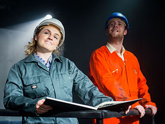 Painter Sue Jane Taylor wanted to document the lives of workers. She got permission in 1987 for a week‘s visit to the Piper Alpha oil rig, the biggest platform in the North Sea. Portrayed by Charlaye Blair as The Artist, she is open faced, na¯ve, full of hope and enthusiasm. She puts on a gray protective suit, the men are in orange coveralls.