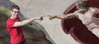 As proof of her power, he demands a bacon sandwich delivered by an owl, and gets it. (The owl has something to do with Harry Potter.) He is impressed. God quickly advises him to ditch segueing into such traditional ideas as heaven and hell: “Actually, they‘re both made up. Most of that stuff, and Original Sin was invented by St Augustine. It‘s basically Biblical fan fiction.”