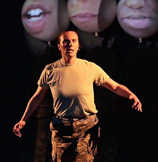 Johannsen wears camouflage pants, a t-shirt and a pony tail. The voices she speaks are pulled together from interviews with women who joined the U.S. armed forces and found that though they were supposed to be fighting stereotypes, they got caught in them. The American women suffered from sexism U.S. military style: no burqas, but plenty of what underlies them.