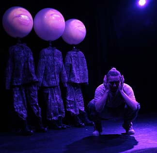 The backdrop is three camouflage-garbed figures with heads of balloons on which will inventively be projected moving features. In a corner is a stack of sandbags topped by a pair of boots. The set and costumes are by Mayou Trikerioti.