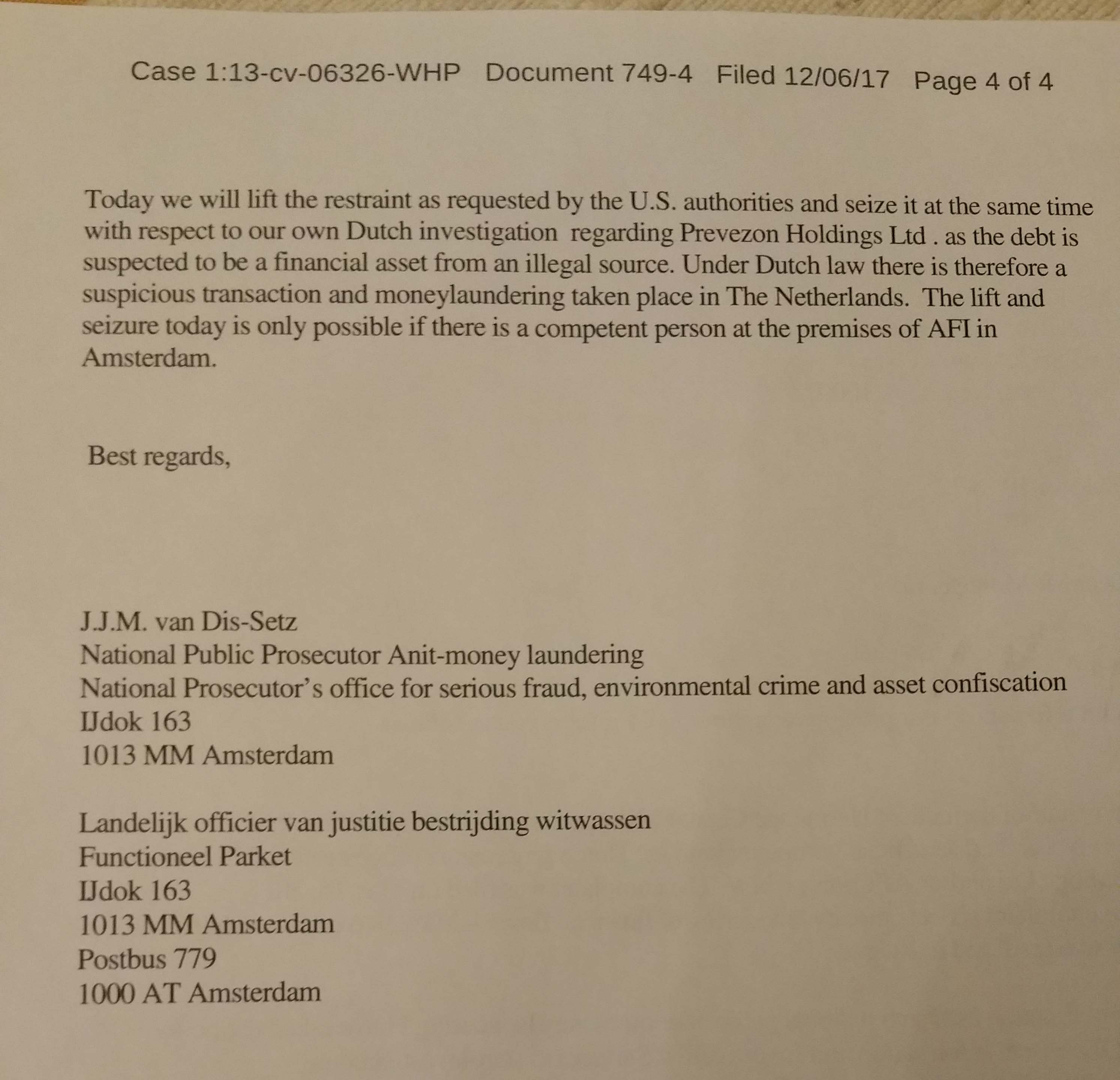 Today at a federal court hearing in New York (Southern District of NY), a U.S. government attorney admitted that he had received information that the Dutch would block release of money that was supposed to settle a dispute between DOJ and the real estate holding company, Prevezon.