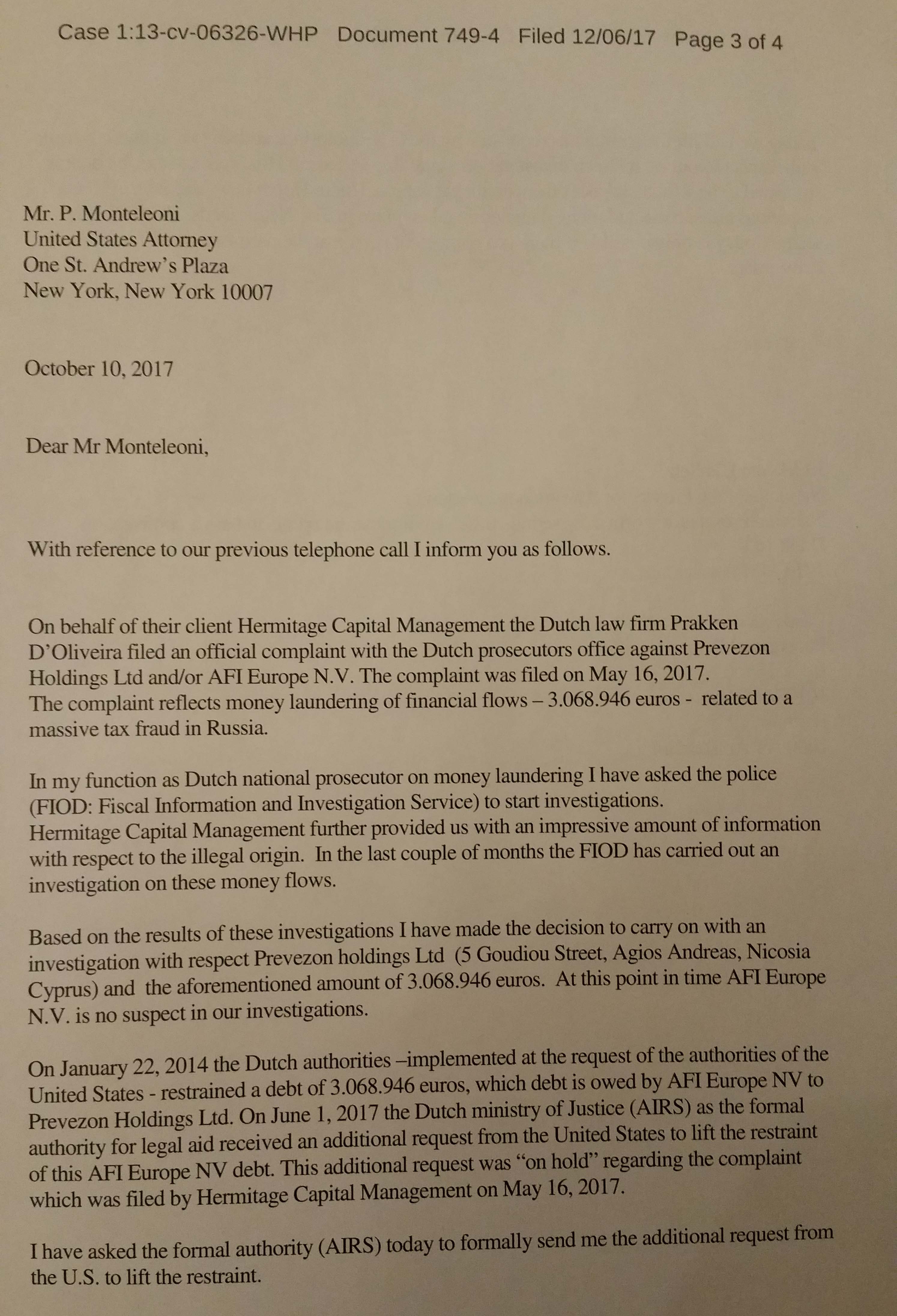 Today, in U.S. federal court in the Southern District of New York U.S. Attorney Paul Monteleoni admitted that the Dutch authorities knew months before the October 10, 2017 unfreezing of the accounts that Browder would bring the new suit. It would unfreeze the account at 1pm and refreeze it at 1pm.