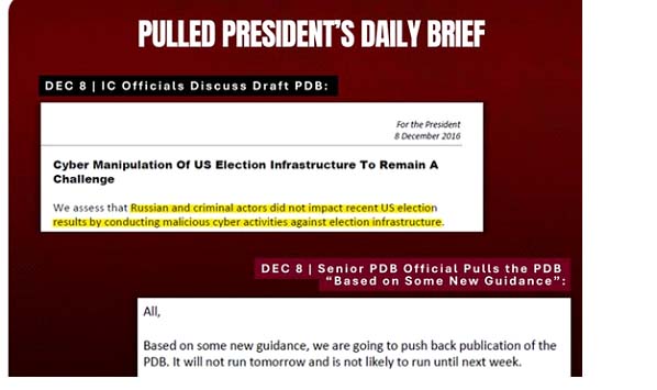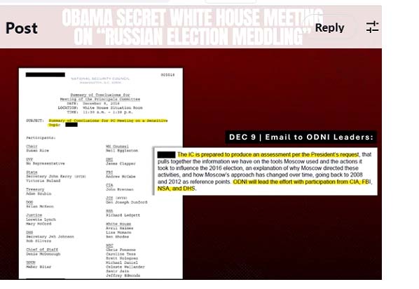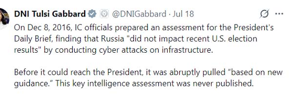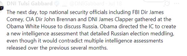 - Alleged Russian interference in 2016 election: One example is obvious from just announced report by Tulsi Gabbard that documents used to back up the contention that the Russians interfered in the 2016 election were faked. [This breaking news story was not mentioned by panelists.]