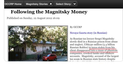 Browder insisted his companies had been stolen and the scheme carried out by miscreants. OCCRP dutifully wrote that crooked Russian investigators had seized documents and company stamps from Hermitage and used them to set up counterfeit subsidiaries. Then Magnitsky presented evidence about this to Russian officials and was arrested. The story, with no evidence, was duly repeated by international media. It was fiction.
