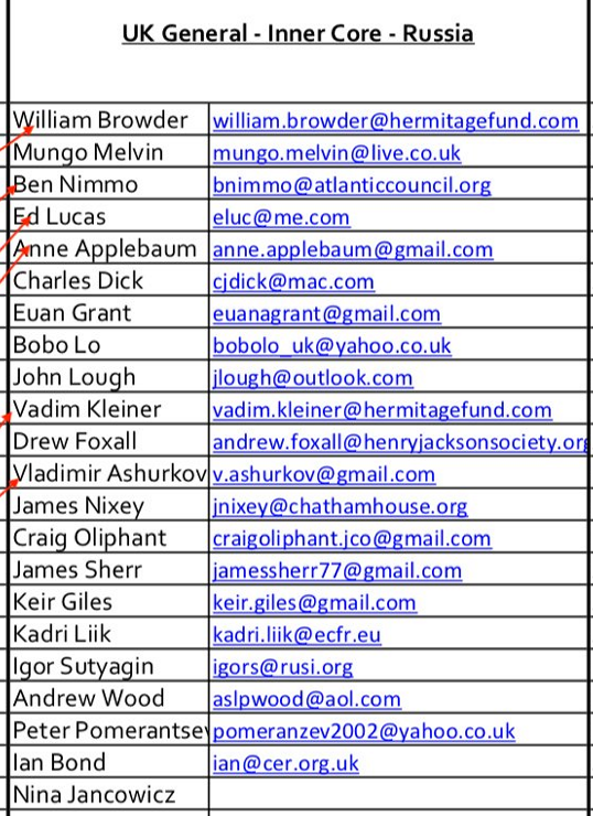 Some of the operatives listed are Browder, Ben Nimmo of the Atlantic Council, the journalists Ed Lucas and Anne Applebaum (who is married to Polish Foreign Minister Radosław Sikorski).