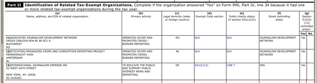 Along with Radu on the Bellingcat board in 2019 was Marietje Schaake (a Dutch politician, former EU member of parliament from the Alliance of Liberals and Democrats for Europe, and columnist for the Financial Times) who shows up in the current OCCRP Board. And on the Bellingcat boards are two former Open Society directors of the Journalism Program, Algirdas Lipstas and Maria Teresa Ronderos.