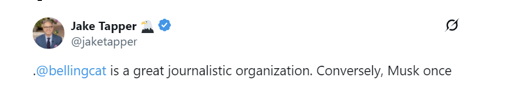 Bellingcat is officially partnered with major media outlets CNN and NBC. CNN’s Jake Tapper has called Bellingcat “a great journalistic organization.”