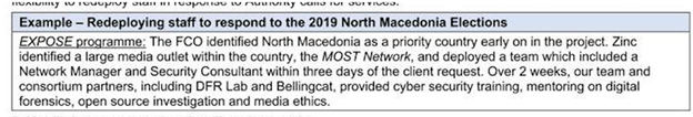 In 2019, as Zinc indicates below, Zinc, Bellingcat and the Atlantic Council’s DFR Lab worked in North Macedonia where an election pitted candidates favorable and unfavorable to NATO. Zinc noted in this leaked document that the Foreign Office (FCO) identified North Macedonia as a priority country. And Zinc “deployed” a number of “partners” including Bellingcat to the country as part of its “response.” Is that the role of real journalists?