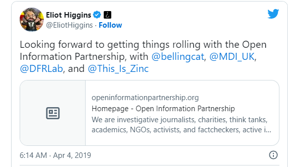 In 2020, Bellingcat was one of four founding “partners” of the Open Information Partnership (OIP), an alliance of organizations “to counter and expose disinformation” funded wholly by the UK Foreign Office. Members of the alliance include Zinc, Atlantic Council’s DFR Lab the British Foreign Office and the NATO Strategic Communications Centre of Excellence.