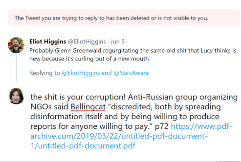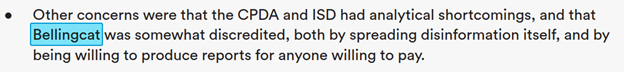 Let’s repeat that. “Bellingcat was somewhat discredited, both by spreading disinformation itself, and by being willing to produce reports to anyone willing to pay.” And this is the organization whose “news” accounts anyone takes seriously?