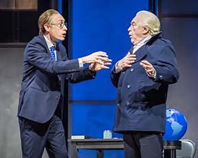 The villain, Fred Goodwin (Sandy Grierson) got plucked with no particular experience to head the Royal Bank of Scotland (RBS). Taking a cue from how the system works, he takes a domestic bank and starts to expand. He sets about to buy stuff (much of it junk) to build up the bank’s (fake) capitalization to spike the stock price and payouts to shareholders and him and other executives.