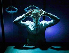 “The Insider” is significant not only for telling the story about one of the world’s biggest financial scams (more than $63 billion in money cheated national treasuries revealed with arrests in 2014 compared to Bernie Madoff’s nearly $65 billion in fake profits revealed in 2008), but directed by Johan Sarauv doing it smartly through a one-man show with headsets provided to the audience so that in one ear they hear a whistleblower (the superb Christoffer Hvidberg Rønje) who we see speaking on stage inside a glass enclosure, and in the other we hear the other recorded characters. (Marion Reuter (Anne Brorhilker, leading detective), Zoe Mills (Nurse, The Virgin Mary, Speaker), Benjamin Kitter (Hanno Berger, tax attorney and criminal), William Halken (new investor).