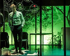 The play focuses on a young financier (Christoffer Hvidberg Rønje) who in 2016 is being interrogated in Germany. He was a lawyer with a family and working at a large bank.