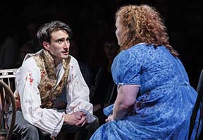 The beaux are all played by the terrific Edoardo Benzoni, including the unassuming Mr. Bigley, the nasty Mr. Wickham and the diffident, shy Mr. Darcey. The excellent Benzoni changes expressions, body movement and sometimes a coat to transform his identity. When Wickham tells Jane he’s “grieving” a break-up, it sounds like a take-down of pop psychology